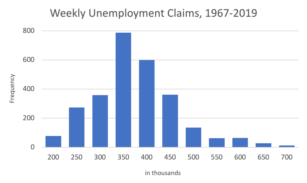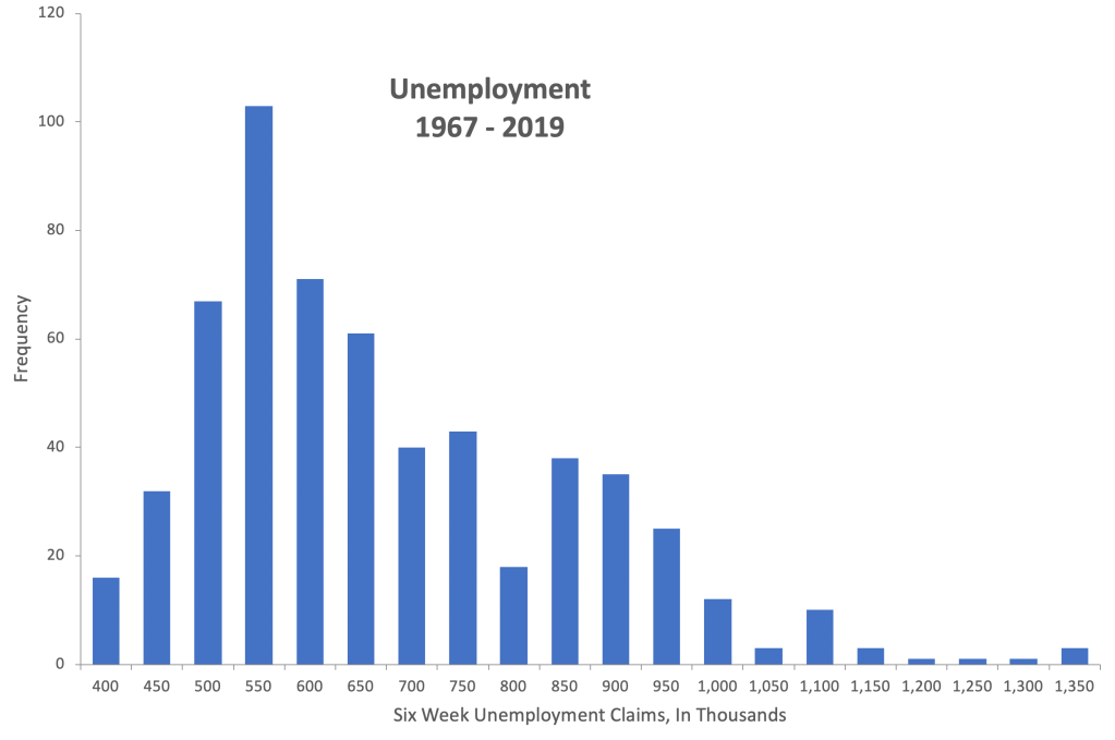 I went back to the data from the previous post and reran the numbers. To get a single-number comparison, I reran the numbers in six-week increments. This histogram shows unemployment from every six-week period from 1967 to the end of 2019.